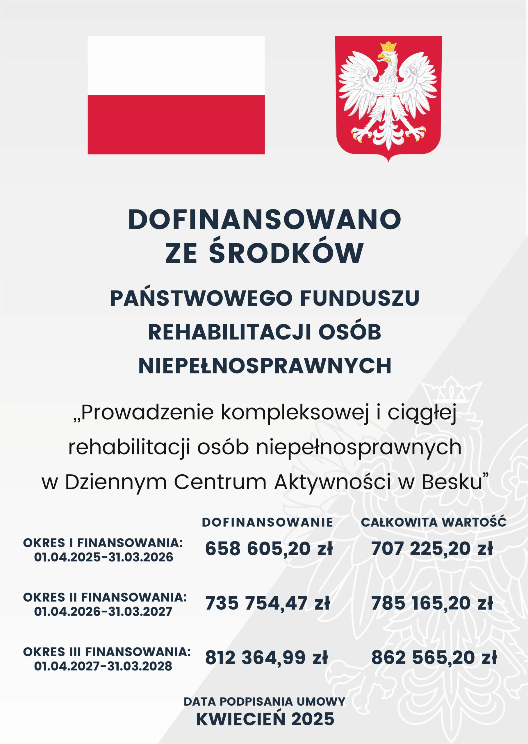 Okres I: 01-04-2025 do 31-03-2026. Całkowita wartość – 707 225,20  zł dofinansowanie- 658 605,20